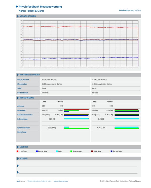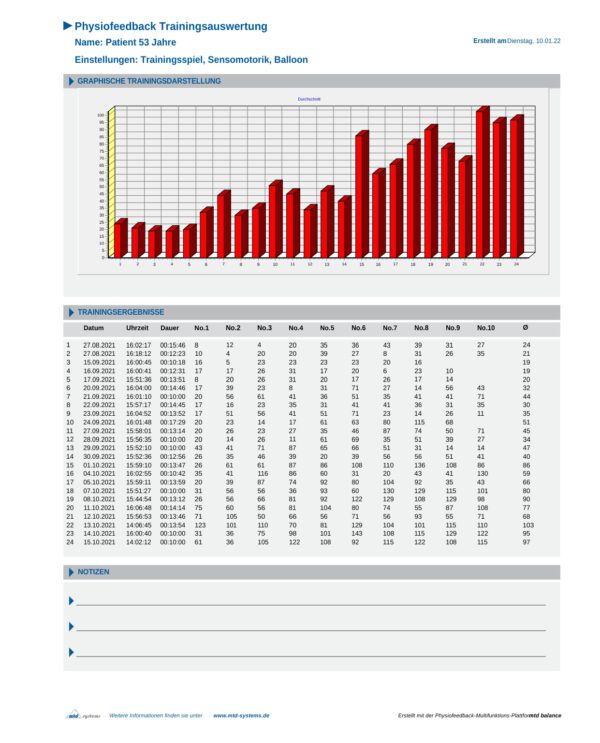 Dokumentation des Trainings – Alle gespeicherten Trainingsdaten wie z.B. Name des Patienten, Trainingsziel, Datum, Zeit und Dauer des Trainings, Anzahl der gemachten Fehler, Trainingsumfang, usw. werden auf Wunsch am Bildschirm in Tabellenform oder grafisch dargestellt. Ebenso können alle Versionen des Trainingsplanes mit allen Parametern angezeigt und ausgedruckt werden. Somit ist der komplette Trainingsverlauf lückenlos dokumentiert.